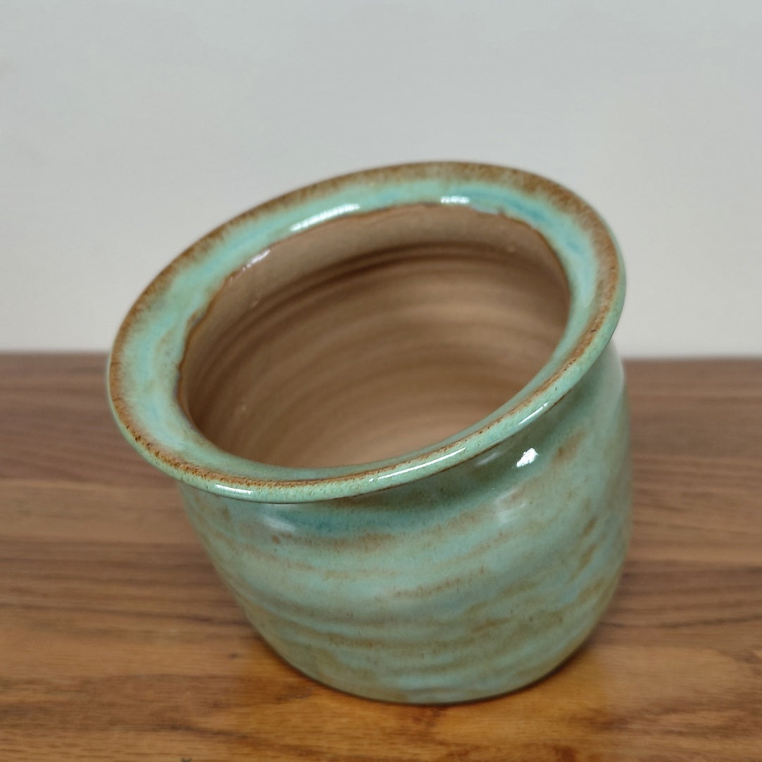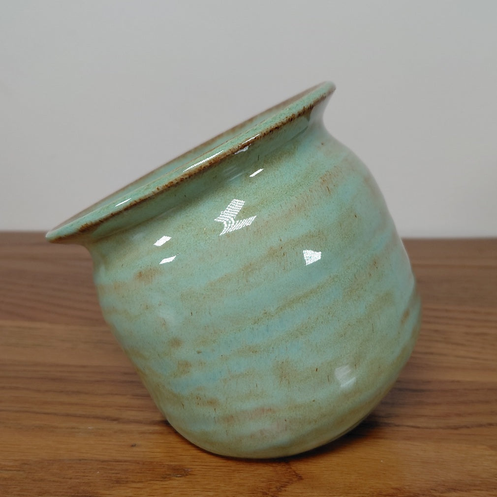 This pale green glaze has a movement to it that really does give any piece of pottery character. As the glaze matures in the kiln it settles in 'waves' on the more vertical surfaces creating multiple rows of slightly darker colour with a variation that adds texture to the item.